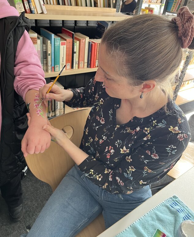 Die Grundschülerinnen und Grundschüler durften aufgeteilt in drei Gruppen der Geschichte lauschen, Zauberstäbe mit der Übermorgenwelt, dem Ulmer Fantasyverein, basteln oder sich Bodytattoos von der Bodypainterin Mechthild Bäuerle sowie von Buchclubmitgliedern aufmalen lassen.
