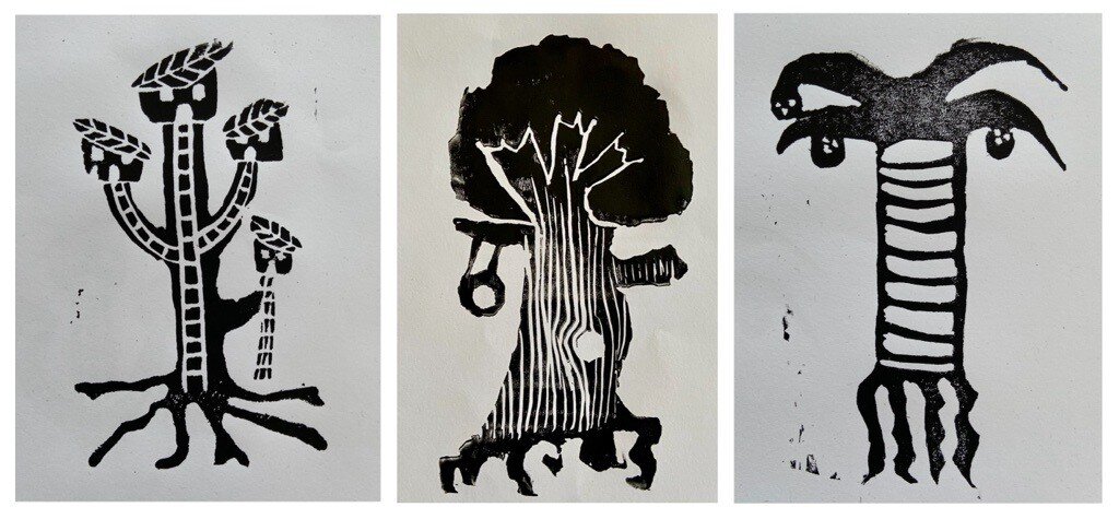 "Baumvariationen mit Linolschnitt" von Clara Burmann 8c, Carlos Kreutzer 8b, Miloslava Prokopenko 8c