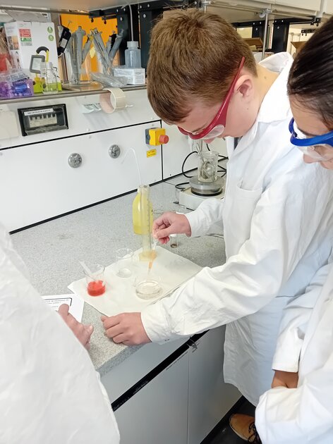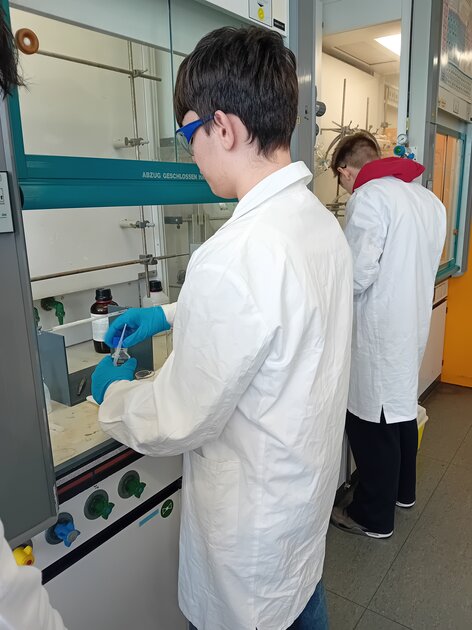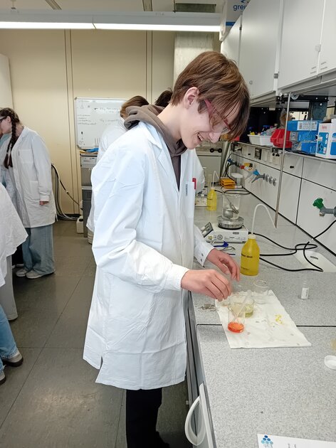 Ein besonderes Highlight war die Herstellung von Biopolymer-Alginat-Kapseln, die an die beliebten „Bubble-Tea-Perlen“ erinnern. Mit großem Interesse beobachteten die Schülerinnen und Schüler die chemischen Reaktionen und konnten ihre eigenen Kapseln produzieren. Ebenso beeindruckend war die Herstellung einer Styroporkugel sowie eines Nylonfadens, bei der deutlich wurde, wie vielseitig Kunststoffe im Alltag eingesetzt werden.