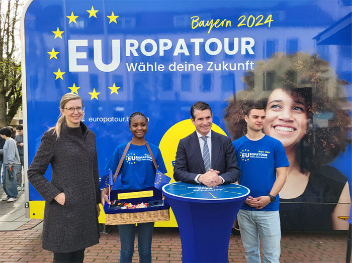 Die 11. Jahrgangsstufe des Lessing-Gymnasiums besuchte am 08. April 2024 die erste Station der diesjährigen EUropatour am Johannesplatz in Neu-Ulm. Die Lernenden konnten in Kleingruppen an einer geleiteten Hörtour um die Kirche St. Johann teilnehmen und spielerische und multimediale Inhalte zum Projekt Europa und der Europawahl am 09. Juni 2024 in Erfahrung bringen. Der Besuch der Klassen 11 fand zeitgleich mit der Auftaktveranstaltung der EUropatour statt, weshalb die Schülerinnen und Schüler auch die Begrüßung durch die Neu-Ulmer Oberbürgermeisterin Kathrin Albsteiger und den bayerischen Staatsminister für Europaangelegenheiten und Internationalem, Eric Beißwanger, erleben konnten. Durch den Besuch der EUropatour konnte die Bedeutung des Projekts Europa veranschaulicht werden, um so den Lernenden einen ersten Anreiz zu geben, die nächsten Europawahlen zu nutzen, um selbst Politik zu machen und ihre Stimme abzugeben.