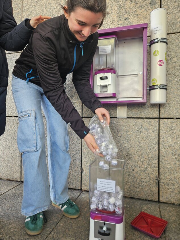 Am Dienstag, 8. April um 13 Uhr war es endlich so weit! Die wochenlange Arbeit an unseren Texten hatte sich gelohnt und wir durften zum ersten Mal den Gedichtautomaten am Stadthaus in Ulm mit unseren ganz eigenen „pocketpoems“ befüllen. „pocketpoems“ – das ist Poesie aus dem Automaten, das sind kleine selbst geschriebene Gedichte für unterwegs, das ist Lyrik für die Hosentasche. Für nur 1 € könnt ihr eines unserer 100 Gedichte in Kapselform dort käuflich erwerben. Zu verdanken haben wir diese spannende Kooperation den zwei Ulmer Autorinnen Rosalie Bertele und Laura Winter. Während sie weiterhin die linke Hälfte des Automaten mit ihrer Poesie versorgen, ist die rechte Hälfte für die Texte unserer Poetry Slam AG reserviert. Wir staunten nicht schlecht, als die zwei Lyrikprofis uns feierlich einen Schlüssel mit den Worten überreichten, dass sie sich darüber freuen würden, wenn wir in Zukunft den Automaten weiterhin mit unseren Texten befüllen würden.