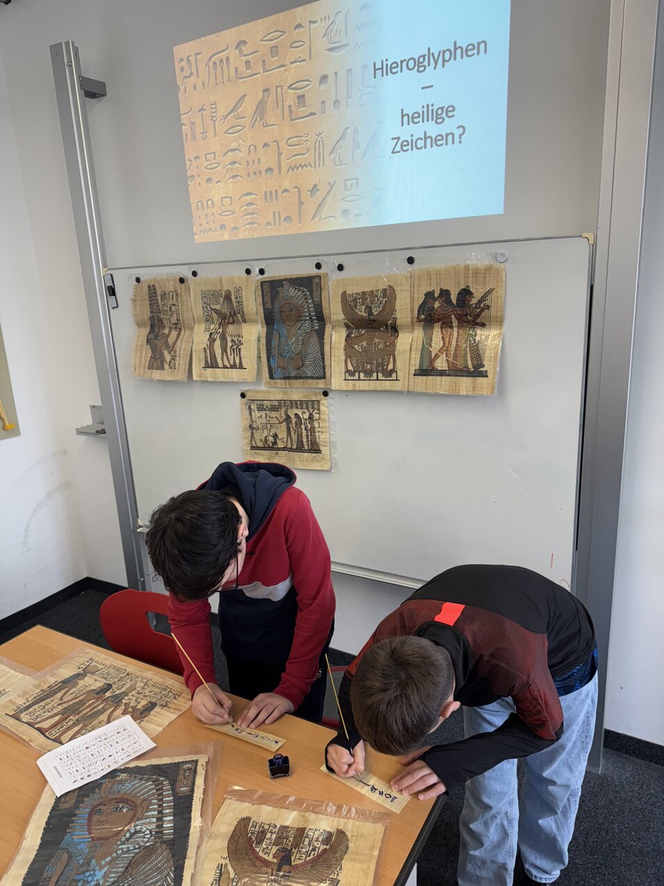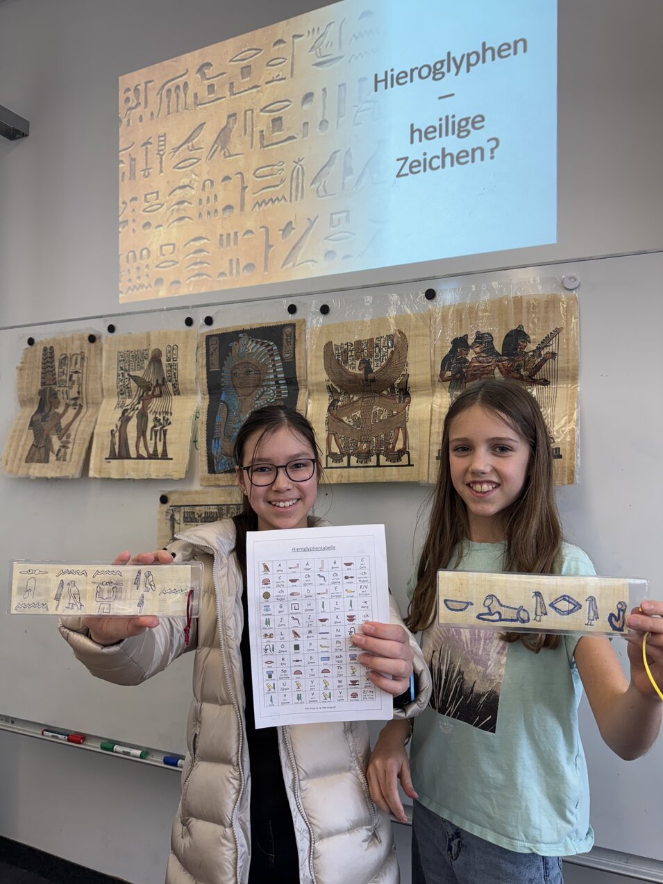 Die Hieroglyphen der Ägypter gehören zu den ältesten Schriften der Welt. Die Schülerinnen und Schüler der Klassen 6b und 6c beschäftigten sich intensiv mit diesen altägyptischen Zeichen. Sie erfuhren Spannendes, z.B. dass die Blickrichtung der Tier- und Menschenfiguren bestimmt, ob die Hieroglyphen von links nach rechts oder andersherum gelesen werden, und sie lernten, ihre eigenen Vornamen in Hieroglyphen zu schreiben. Anschließend bastelten sie Lesezeichen - jedoch nicht mit Stift und Papier, sondern mit sogenannten Binsen und Papyrus, dem Schreibwerkzeug der alten Ägypter. Das historisch authentische Material ließ das alte Ägypten (wenn auch nur innerhalb des Klassenzimmers) auferstehen. Mithilfe einer Hieroglyphen-Tabelle personalisierten die Kinder ihre Lesezeichen und verpassten ihnen so den letzten Schliff.