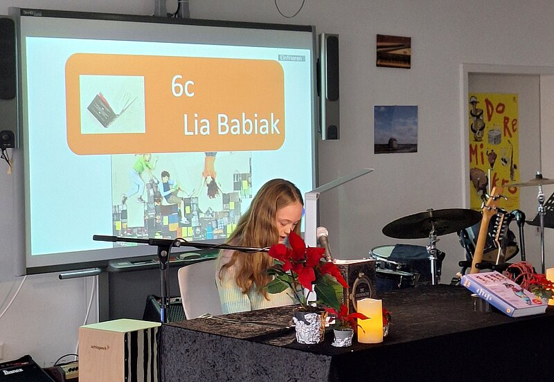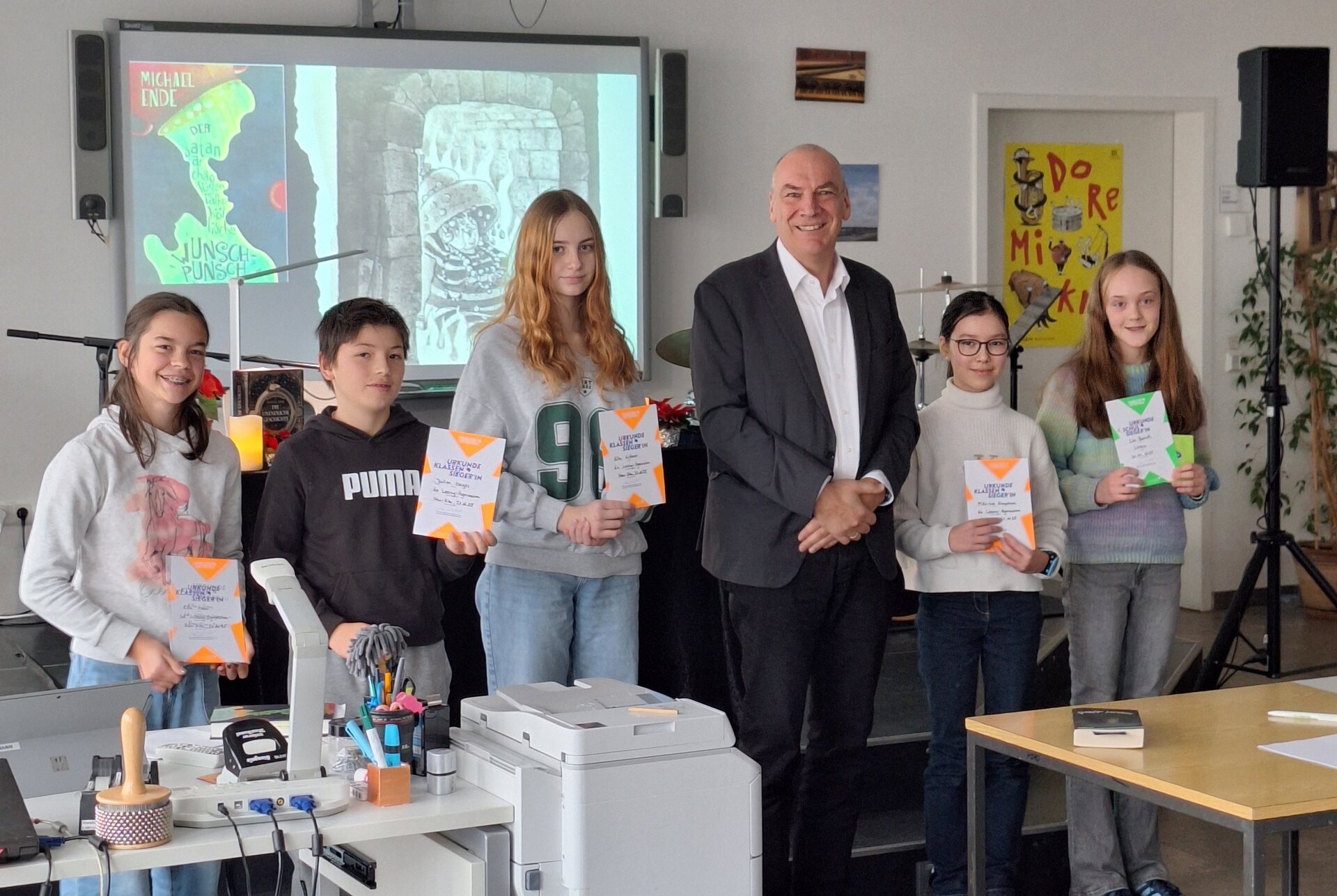 Zweite Schulsiegerin wurde Miên-Lia Knuplesch (6b), die mit einer nuancenreichen Interpretation glänzte. Auch die Siegerinnen und Sieger der anderen Klassen - Julian Geiger (6e), Ella Heen (6d) und Ella Krämer (6a) - beeindruckten mit großem Lesetalent und Freude am Vorlesen.